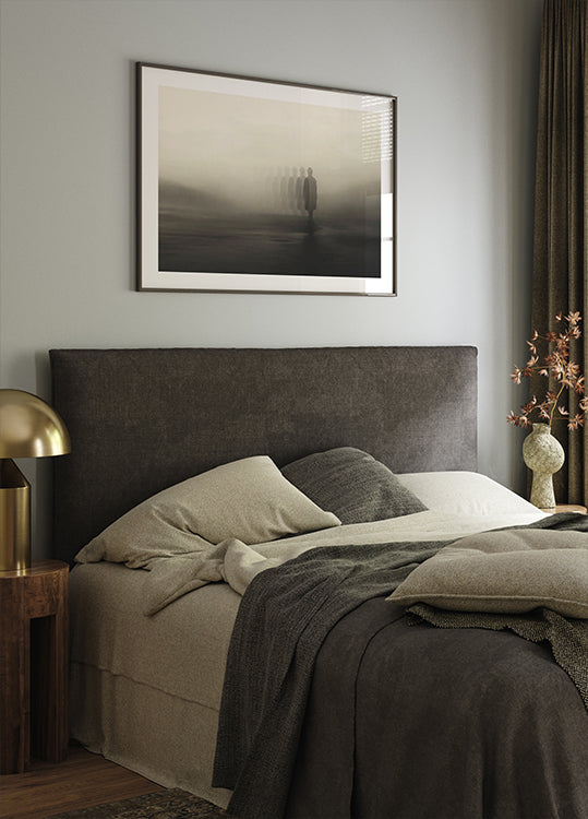 Ein poetisches und verstörendes Motiv einer männlichen Figur, die langsam am nebligen Horizont verschwindet. Das Bild balanciert zwischen Realität und Traumhaftigkeit und wirft Fragen zu Identität und Zeit auf.