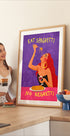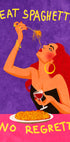 Eine kühne und verspielte Illustration einer glamourösen Frau, die Spaghetti und Rotwein genießt, mit dem humorvollen Satz „Eat Spaghetti, No Regretti“. Das Kunstwerk vereint Humor, Weiblichkeit und Stil und eignet sich perfekt als Statement in der Küche, im Esszimmer oder als moderne Wanddekoration.