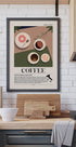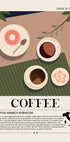 Ein italienisch inspiriertes Poster, das die Umrisse von Kaffeetassen, einem Dessert und Zuckerwürfeln auf einem Tisch zeigt. Das Poster beleuchtet die Geschichte und den Herstellungsprozess des Kaffees mit Schwerpunkt auf der italienischen Espressotradition. Perfekt für Cafés, Kaffeeliebhaber und Liebhaber der italienischen Kultur.
