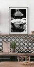 Schwarz-weißes Stillleben einer Espressomaschine, die dunkle Tropfen in eine wartende Tasse fallen lässt. Der Dampf steigt auf, das Licht funkelt im Stahl und die scharfen Kontraste schaffen Ruhe. Ein minimalistischer Moment des Morgenrituals und der Café-Atmosphäre, perfekt, um Wärme, Konzentration und Präsenz in die Küche, das Wohnzimmer oder die Kaffeeecke zu bringen.