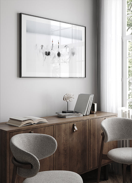 Der anmutige Tanz zweier roter Kraniche schwebt über einer schneebedeckten Landschaft, eingefangen in einem kalligrafischen Ausdruck von Larry Deng APA. Die weichen, tuscheartigen Striche und der minimalistische Raum erzeugen Ruhe, Bewegung und Poesie – wie Winterwind auf Papier – eine stille Hommage an japanische Eleganz und den Rhythmus der Natur. Ein poetischer Look für Ihren Raum.