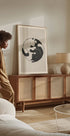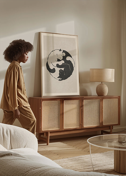 Ein minimalistisches Schwarz-Weiß-Kunstplakat mit zwei Katzen, die in einer Yin-Yang-Formation zusammenliegen und Gleichgewicht, Frieden und Harmonie symbolisieren. Ein zeitgenössisches Stück, perfekt für Katzenliebhaber und alle, die ein ruhiges, modernes Design schätzen.