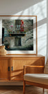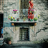 Chains of Gold von ambra fängt einen farbenfrohen urbanen Moment ein: Eine junge Frau steht auf einem schmiedeeisernen Balkon, wo sich goldene Ketten wie Schmuck vor einer verblassten Fassade winden. Eine rote Tür, Blumentöpfe und feine Schatten schaffen einen Kontrast zwischen urbaner Patina und eleganter Poesie – eine lebendige Hommage an die Alltagsarchitektur.