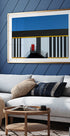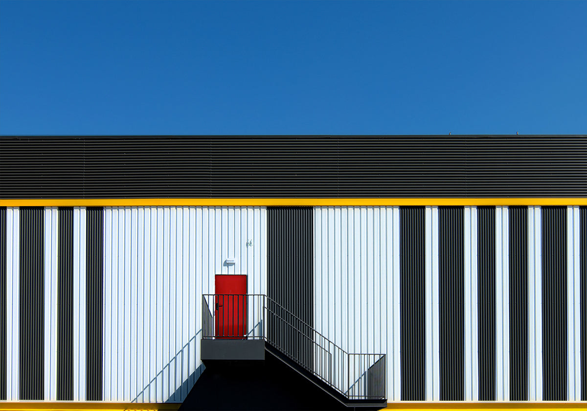 Piano von Alfonso Novillo fängt den Rhythmus der Stadt in einer grafischen Komposition aus roten und gelben Toren, Wellenoptik und scharfen Linien vor einem klaren blauen Himmel ein. Eine Industriefassade mit Treppen und schmalen Streifen sorgt für starke Kontraste und architektonische Ruhe – perfekt für eine moderne, urbane Einrichtung. Inspiriert von der Stadt Madrid vereint das Motiv Container-Optik und grafische Ruhe.