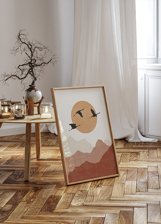 Kran-Silhouetten bei Sonnenuntergang Poster