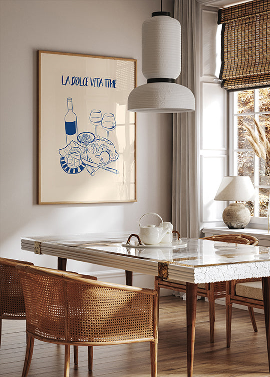 Ein schlichtes und gemütliches Line-Art-Poster mit Wein, Käse, Obst und Brot – inspiriert vom Mittelmeerraum. Der Text „La Dolce Vita Time“ umrahmt das gute Leben, die Entspannung und den italienischen Charme. Ideal für die Küche.