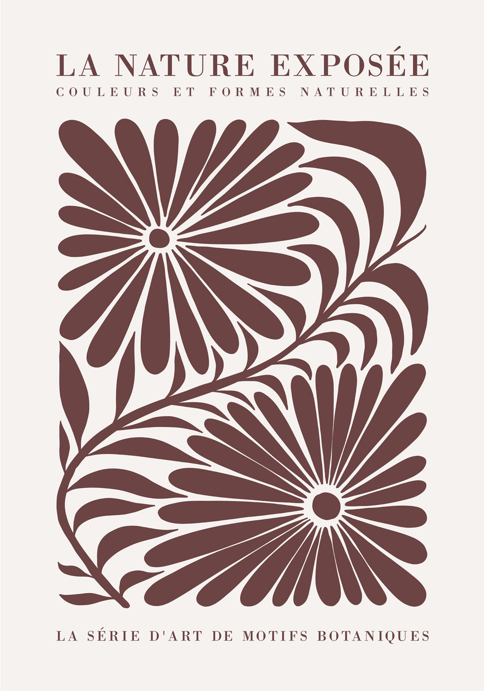 Ein stilvolles botanisches Kunstposter mit zwei abstrakten Blumen und eleganten Blättern in einem natürlichen Erdton. Inspiriert vom französischen Vintage-Design kombiniert diese minimalistische Illustration Natur und Raffinesse – perfekt für eine moderne Einrichtung.