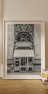 Ein bezauberndes Schwarz-Weiß-Foto der legendären Konditorei Ladurée, bekannt für ihren eleganten Pariser Stil und ihre weltberühmten Macarons. Die kunstvolle Architektur und die Café-Stühle erwecken das Gefühl von französischem Luxus und Genuss und machen diesen Druck zu einer anspruchsvollen Wahl für Innenräume, die von Mode, Kultur und zeitlosem Geschmack inspiriert sind.