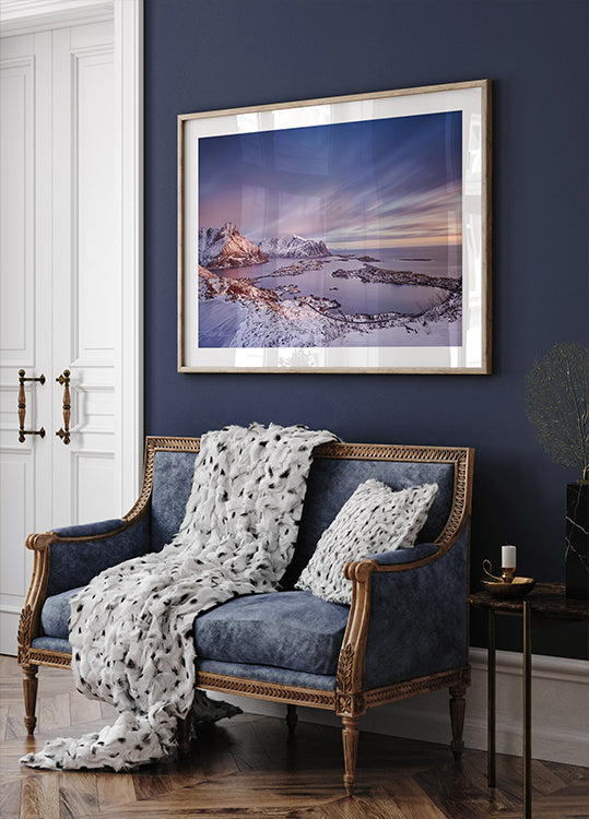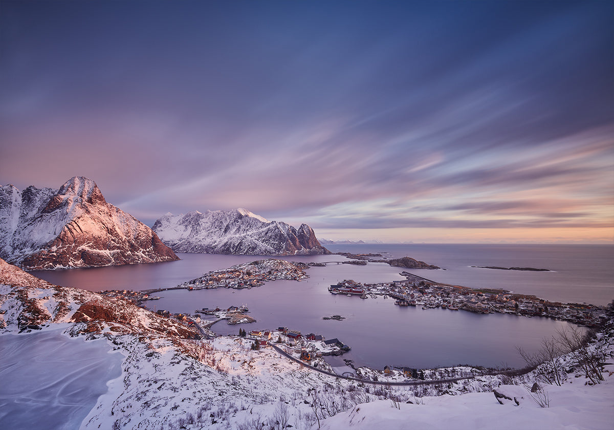 Purple Haze von Rafal R. Nebelski fängt die dramatische Winterlandschaft der Lofoten in sanften Violetttönen ein. Sonnenstrahlen brechen durch die Wolken über Fjorden und schneebedeckten Bergrücken, während das Meer ruhig am Fuße der steilen Hänge liegt. Ein eindrucksvoller Blick mit nordischer Poesie und Tiefe. Das Motiv lenkt den Blick von Reinebringen auf das Meer.