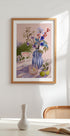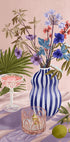Dieses lebendige Stillleben-Kunstwerk zeigt eine gestreifte Vase mit bunten Blumen, umgeben von tropischen Blättern und Glas auf einer strukturierten Oberfläche. Die Komposition schafft eine harmonische Mischung aus Natur und moderner Ästhetik und verleiht jedem Raum sowohl Frische als auch Eleganz.