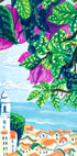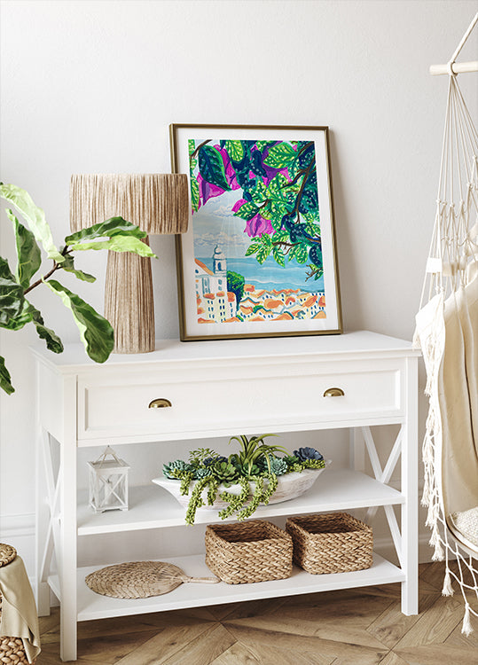Eine lebendige Hommage an Lissabon: sonnendurchflutete Fassaden, Blumen in den Fenstern und eine Vielzahl bunter Häuser, die allmählich zum blauen Meer hin abfallen. Die freien Pinselstriche und die impressionistische Stimmung fangen die pulsierende Energie der Stadt ein. Mit Blick auf Hügel und Dächer, getaucht in warme Farben. Erstellt von Pauline Wegman | Key and Sea Creative.