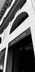 Ein beeindruckendes Schwarz-Weiß-Foto des Louis Vuitton Stores in Rom, das die raffinierten Bögen und die moderne Luxusfassade einfängt. Dieser Druck zelebriert die zeitlose Eleganz eines der berühmtesten Modehäuser der Welt und wird zu einer raffinierten Ergänzung für Innenräume, die von Reisen, Architektur und Haute Couture inspiriert sind.
