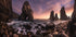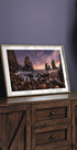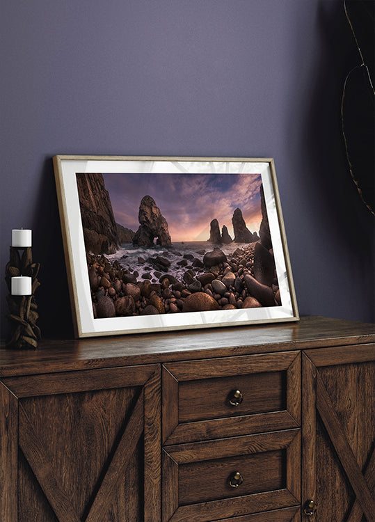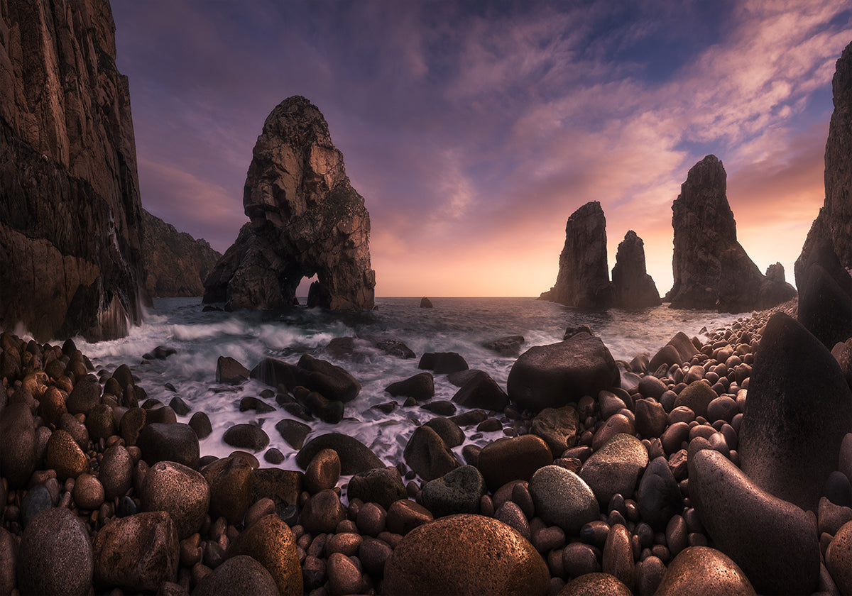 Ein goldener Sonnenuntergang färbt den Atlantischen Ozean bei Louriçal an Portugals wilder Küste von Sintra-Cascais. Mächtige Klippen und Natursteinbögen erheben sich aus dem Schaum, während im Vordergrund die Wellen über runde Kieselsteine rollen. Carlos F. Turienzo fängt das Drama und die Ruhe einer zeitlosen Küstenlandschaft ein. Der Horizont leuchtet in Lila und Bernstein, während der Himmel den Rhythmus des Meeres widerspiegelt.