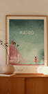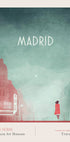 Madrids Gran Vía erstrahlt nach Einbruch der Dunkelheit im eleganten Retro-Reiseplakatstil: Leuchtende Zelte, Art-déco-Fassaden und weitläufige Boulevards treffen unter einem tiefen Nachthimmel aufeinander. Scheinwerfer strömen wie Bänder, Silhouetten stapeln sich zu einer kühnen Skyline und die berühmten Theater und Dächer der Stadt laden Wanderer ein, im elektrischen Herzen Madrids zu schwelgen.