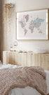 Entdecken Sie die Welt in einem eleganten Überblick: Ein äußerst detailliertes Weltkartenposter mit klaren Stadtmarkierungen, gemalt in sanften Aquarellstrukturen und gedämpften Pastelltönen auf einem reinweißen Hintergrund. Kontinente und Küsten heben sich scharf ab, perfekt für Tagträume und Reisepläne. Von Rosana Laiz Blursbyai. Ein moderner Hingucker sowohl zu Hause als auch im Büro.
