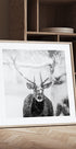 Ein majestätisches Rothirsch steht still im dichten Schneefall, umrahmt von einem dunklen Winterwald und einem sanften Bokeh, das die ruhige, nordische Atmosphäre verstärkt. In Schwarz und Weiß werden Geweih, Fell und Atem in der Kälte betont. Ein poetischer Moment aus dem rauen Winter der Natur, eingefangen vom Fotografen Alexandru Handrache. Perfekt für eine winterliche Atmosphäre im Zuhause.