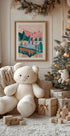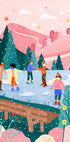 Ein verspieltes Wintermotiv von Bea Müller: Auf einem zugefrorenen See laufen Kinder und Erwachsene um einen geschmückten Weihnachtsbaum herum, während Schneeflocken in der Luft tanzen. Der Hintergrund offenbart sanfte Berge und dunkles Fichtenholz, die die festliche Atmosphäre umrahmen. Die Farben sind warm und lebendig, voller Winterzauber. Eine Hommage an die Familie, die Gemeinschaft und die Freude an der Jahreszeit.