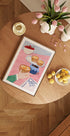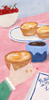Eine herzliche Hommage an Lissabon: eine gemütliche Tischszene mit schwarzem Kaffee, frischen Kirschen und knusprigen Pastéis de Nata. In einer minimalistischen Retro-Farbpalette lädt das Motiv zu ruhigem Alltagsluxus und Reisefieber ein. Naive, moderne Linie der Künstlerin Dirkie Nell, perfekt für Küche, Kaffeeecke und mediterrane Atmosphäre.