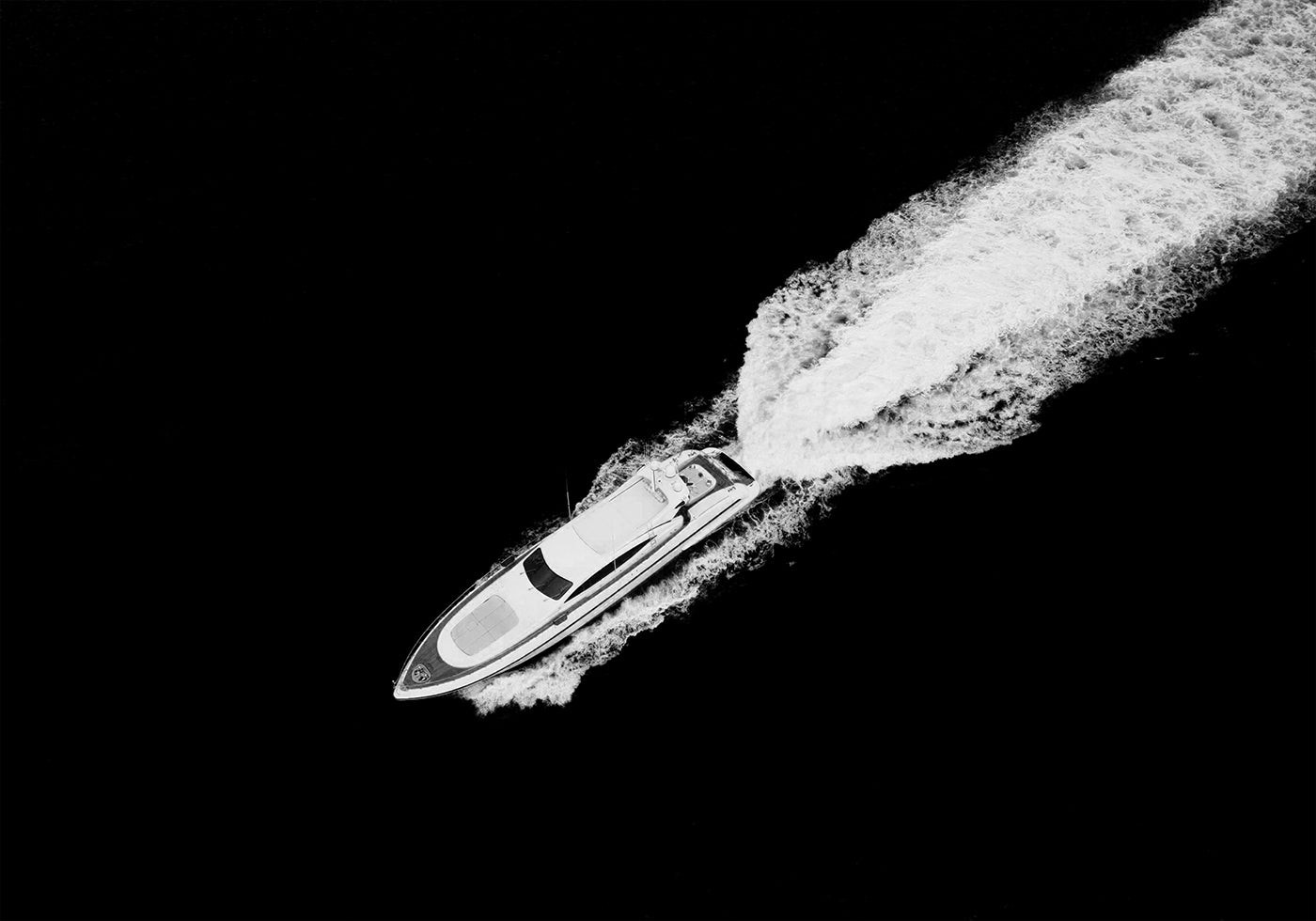 Eine elegante Yacht schneidet in starkem Kontrast durch das dunkle Wasser, von oben in raffiniertem Monochrom eingefangen. Dieses minimalistische Motiv zelebriert Freiheit, Präzision und die Ästhetik der Bewegung – ideal für moderne Innenräume mit Sinn für Stil und Ruhe.