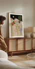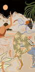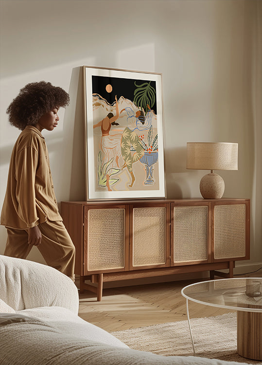 Mondschein-Tanz-Poster fängt einen Moment purer Freude und Freiheit ein, wenn sich zwei Frauen im warmen Schein des Vollmonds anmutig bewegen. Mit einer verträumten Palette aus erdigen Beigetönen, tiefem Schwarz und sattem Grün vereint sich die Natur mit der ausdrucksstarken menschlichen Form. Lockere, malerische Linien und strukturierte Schattierungen verleihen dem Werk eine dynamische, fast ätherische Qualität. Fließende Stoffe mit Streifen- und Blattmustern wiegen sich bei Bewegung, während umliegende Pflanzen und eine klassische Urne für Eleganz sorgen. Dieses Kunstwerk strahlt einen unbeschwerten Geist aus und dient als beeindruckendes Herzstück in böhmischen, modernen oder von der Natur inspirierten Innenräumen.