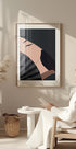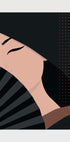 Ein fesselndes Porträt einer Geisha, die teilweise hinter einem traditionellen Fächer versteckt ist und deren Augen unter einem dunklen Hut leicht geschlossen sind. Die klaren Linien und gedämpften Töne vermitteln ein Gefühl von Geheimnis und Eleganz – perfekt für japanische, kulturelle oder moderne Innenräume.