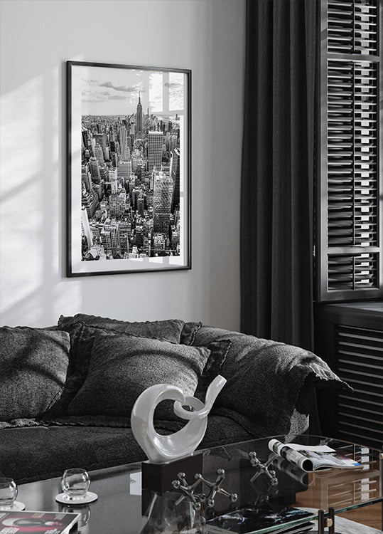 Ein eindrucksvolles Schwarz-Weiß-Foto der Skyline von New York City, mit dem ikonischen Empire State Building, das über der dichten Zersiedelung thront. Der hohe Kontrast hebt architektonische Details hervor und macht dieses Poster zu einer stilvollen Wahl für Stadtliebhaber, Reisende und moderne Dekore.