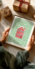 Schmücken Sie die Wände mit einer gemütlichen Weihnachtsidylle: ein rotes Haus mit schneebedecktem Dach und goldenem Licht in den Fenstern, umgeben von sanften Schneeflocken auf einem festlichen grünen Gingham-Hintergrund. Das Motiv vereint Retro-Charme und nordische Schlichtheit – perfekt für den Eingangsbereich, die Küche und das Kinderzimmer, wo es Wärme und Weihnachtsfreude verbreitet. Ein perfektes Geschenk für Weihnachtsbegeisterte.