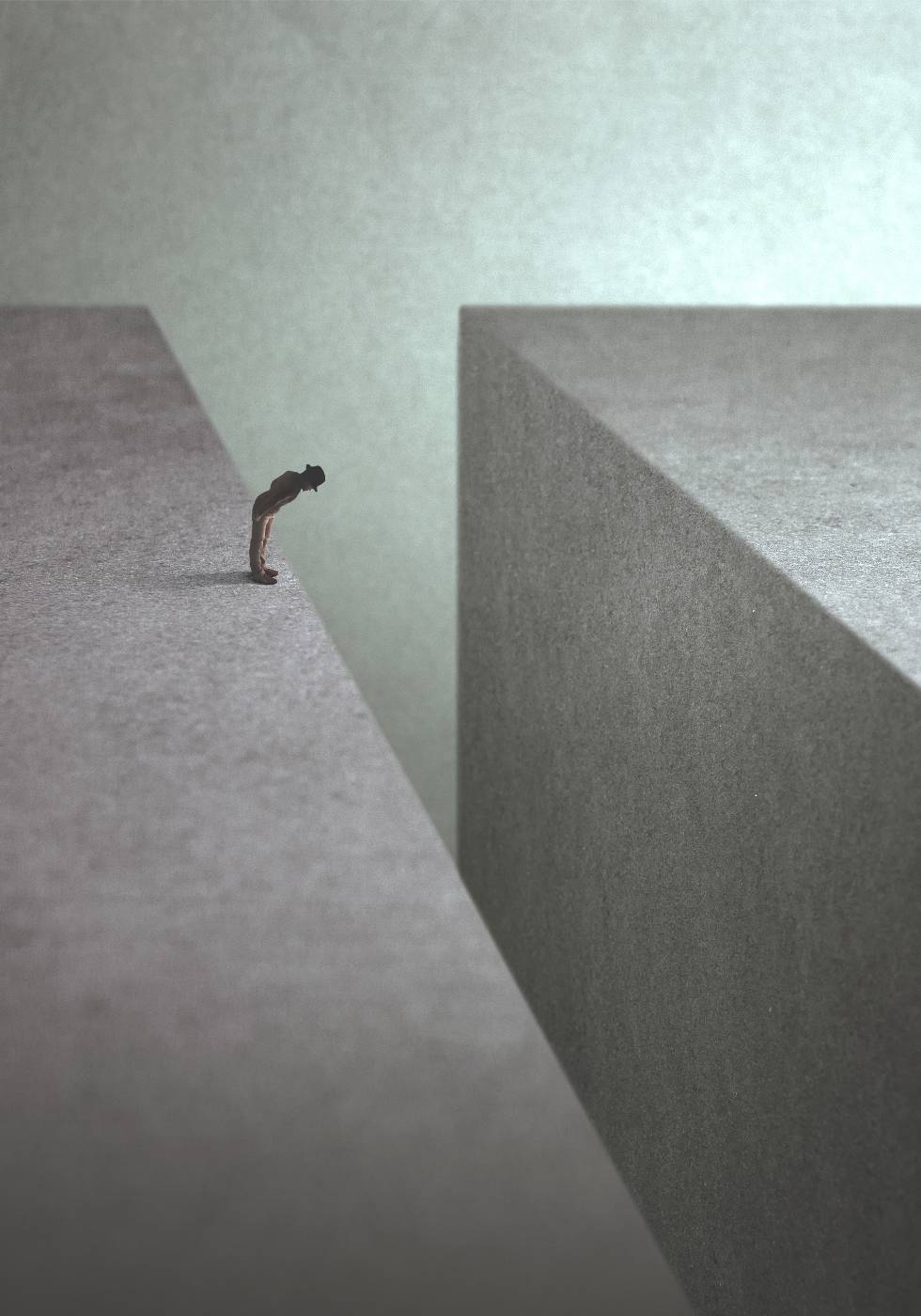 Ein zum Nachdenken anregender surrealer Kunstdruck, der eine Miniaturfigur zeigt, die am Rand einer riesigen Betonplattform steht und ins Ungewisse starrt. Die gedämpften Farben und das minimalistische Design wecken Gefühle der Kontemplation, des Mutes und der Existenz. Perfekt für alle, die tiefgründige Konzeptkunst und Symbolik schätzen.