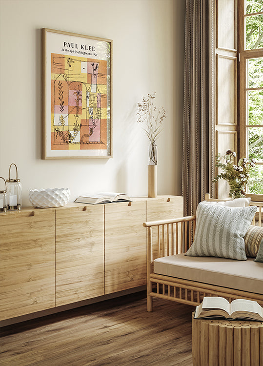 Eine fesselnde Komposition von Paul Klee aus dem Jahr 1921, inspiriert von E.T.A. Hoffmanns mysteriösem und surrealem Universum. Dieses abstrakte Werk kombiniert geometrische Formen mit verspielten organischen Linien und schafft so eine verträumte architektonische Landschaft. Mit warmen Ocker-, Pfirsich- und Zartrosatönen zeigt dieses Kunstwerk Klees charakteristische Verschmelzung von Fantasie und Struktur – eine ideale Ergänzung für eine moderne Kunstsammlung.
