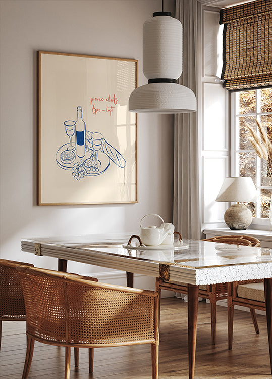 Eine elegante Line-Art-Illustration eines Picknicks mit einer Weinflasche, zwei Gläsern, Käse, Trauben und Baguette, ergänzt durch den Text „Picknick-Club 18:00 Uhr – spät“. Perfekt, um Sommerstimmung und südländischen Charme in Küche und Esszimmer zu bringen.