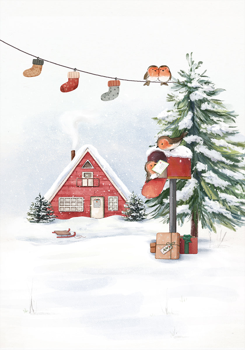 Ein herzerwärmendes Winterplakat von Xuan Thai: Kleine, niedliche Vögel versammeln sich im Schnee um ein rotes Haus, während Sterne über einem geschmückten Weihnachtsbaum funkeln. Sanfte Farben und verspielte Details verbreiten weihnachtliche Atmosphäre und Ruhe – perfekt für das Kinderzimmer, das Wohnzimmer oder als gemütliche saisonale Dekoration. Ein bezauberndes Motiv, das sowohl im Eingangsbereich als auch als Geschenk zur Weihnachtszeit gut funktioniert.