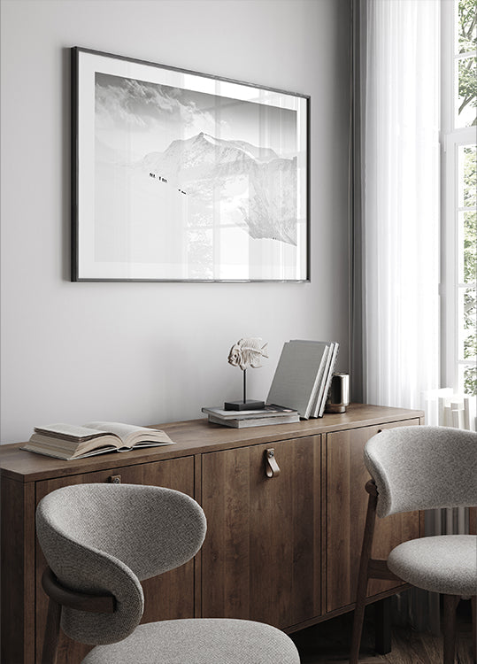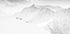 Eine helle, minimalistische Szene aus den Sunnmør-Alpen in Norwegen: eine Reihe kleiner Silhouetten von Wanderern und Skifahrern, die sich in einer Reihe entlang eines schneebedeckten Bergrückens auf einen entfernten Gipfel zubewegen. Die feinen Linien und das hohe Licht erzeugen einen grafischen, fast schwerelosen Ausdruck. Foto von Åsmund Keilen. Der Kontrast zwischen der weißen Schneelandschaft und den dunklen Figuren verleiht Tiefe und Ruhe.