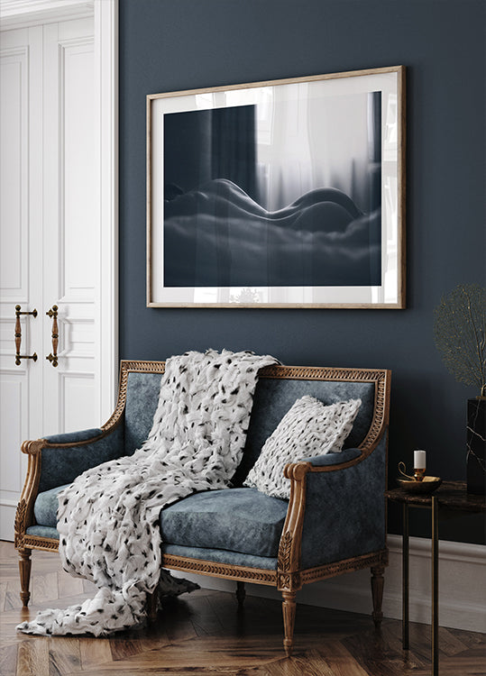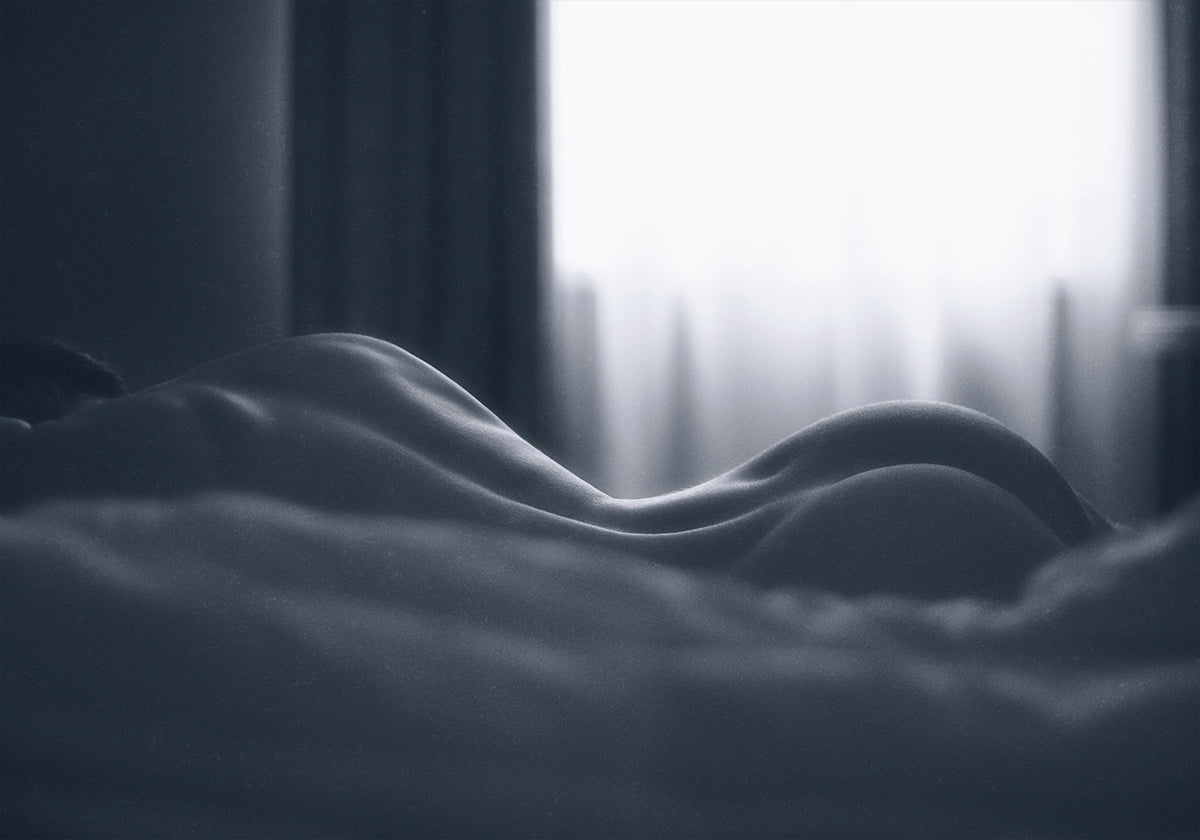 Diese eindrucksvolle monochrome Körperlandschaft fängt die sinnlichen Kurven des weiblichen Körpers ein, der in sanftes Fensterlicht getaucht ist. Das feine Zusammenspiel von Schatten und Licht unterstreicht die figurative Eleganz und schafft ein raffiniertes Kunstwerk, das Intimität, Sinnlichkeit und künstlerische Raffinesse vereint.