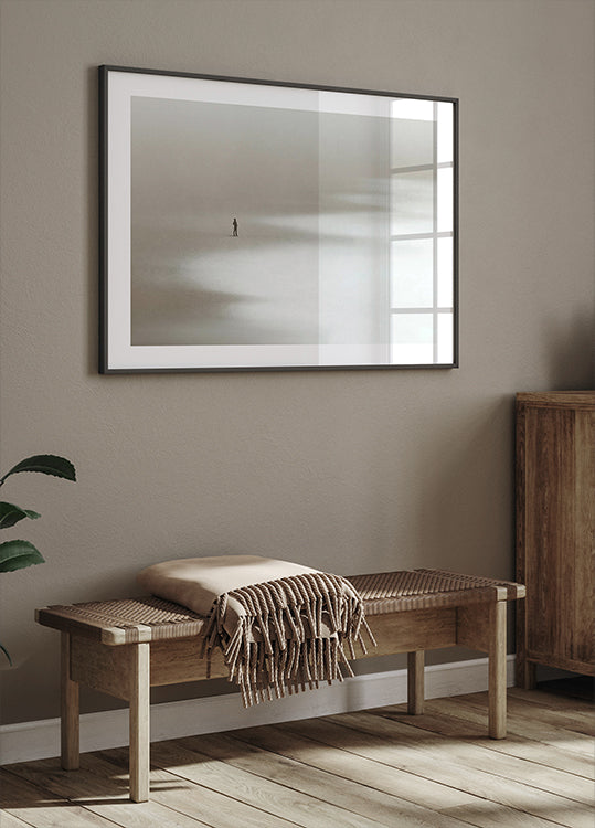 Eine einzelne Person steht still an einem nebligen Strand, umgeben von sanften Schatten. Ein verträumtes und minimalistisches Werk, das Ruhe, Besinnung und die Kraft der Stille vermittelt.