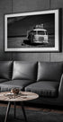 Ein eindrucksvolles Schwarz-Weiß-Foto eines verlassenen Oldtimerbusses, der an einem Sandstrand gestrandet ist. Mit auf dem Dach gestapelten abgenutzten Koffern und dem Meer im Hintergrund drückt das Bild verlassene Reisen, Verfall und den Lauf der Zeit aus.