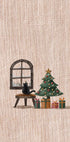 Ein bezauberndes, von Stickereien inspiriertes Kunstwerk mit einer schwarzen Katze, die an einem Fenster sitzt und auf den Schnee blickt. Ein geschmückter Weihnachtsbaum mit Geschenken sorgt für Gemütlichkeit und eine weihnachtliche Atmosphäre, perfekt als Weihnachtsdekoration für zu Hause.