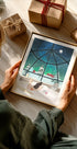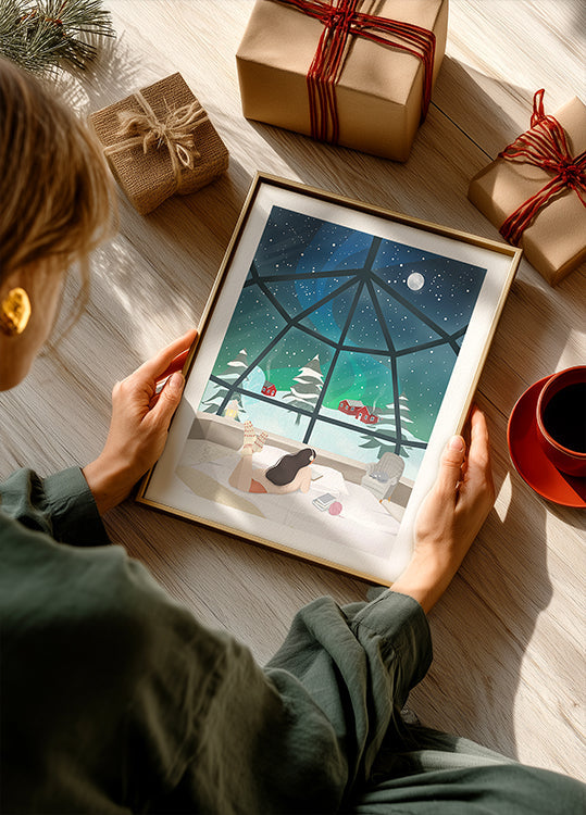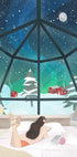 Beim Tanz der Nordlichter über den schneebedeckten Tannen Lapplands leuchtet ein Glas-Iglu wie eine warme Lampe in der Nacht. Darin sitzt eine Frau mit einem Buch und der Katze zu ihren Füßen, eingehüllt in Frieden und Winterzauber. Die Illustration von Petra Lizde bringt Abenteuer und Gemütlichkeit in Einklang und lädt zum Träumen von den ruhigen Nächten des Nordens ein. Eine perfekte Hommage an die arktische Nacht.