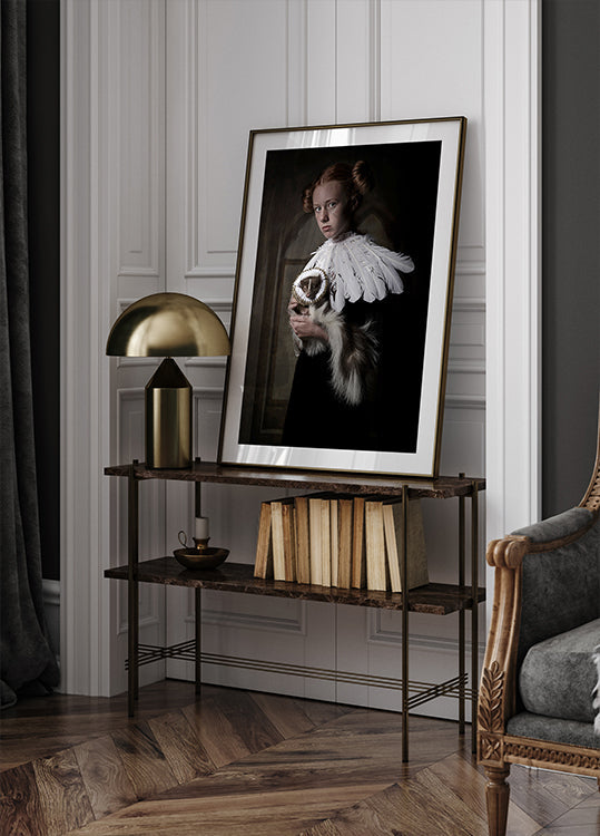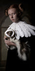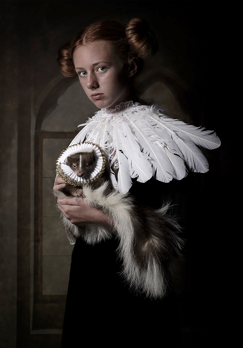Dieses eindrucksvolle Porträt der niederländischen Künstlerin Carola Kayen-Mouthaan zeigt eine gelassene junge Frau in mittelalterlich anmutendem Vintage-Kleid, geflochtenem Haar und Federkragen, die sich den Rahmen mit einem sanften Stinktier teilt. Dramatische, nostalgische Beleuchtung und raffinierte Texturen verleihen der Eleganz der alten Welt eine verspielte, märchenhafte Note mit Anklängen an die Porträtmalerei der Renaissance.