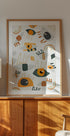 Ein verspieltes und surreales abstraktes Poster mit auffälligen Augenmotiven in warmen Orange-, Ocker- und Grüntönen. Mit seinem Mid-Century-Modern-Look und dem geometrischen Muster vereint das Kunstwerk sowohl Verspieltheit als auch Eleganz – eine perfekte Wahl für Retro-inspirierte Innenräume, eklektische Galeriewände oder Bohème-Wohndekoration.