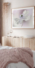 Eine zarte Nahaufnahme einer weißen Anemonenblüte, in der sich weiche Blütenblätter mit anmutiger Bewegung entfalten. Eingefangen in verträumten Pastellfarben in Rosa und Lila, unterstreicht dieses botanische Kunstwerk die Zerbrechlichkeit und Schönheit der Natur und verleiht jedem Interieur eine ruhige und elegante Stimmung.
