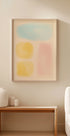 Ein weiches und luftiges abstraktes Kunstwerk mit zarten Strichen in Gelb, Rosa und Blau auf einem warmen beigen Hintergrund. Die beruhigende Pastellpalette schafft ein Gefühl von Ruhe und Schlichtheit – perfekt für Kinderzimmer, gemütliche Leseecken oder moderne minimalistische Innenräume.
