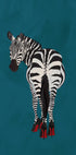 Dieses moderne Kunstwerk zeigt ein Zebra vor einem blaugrünen Hintergrund, das sich durch seine stilvollen schwarzen Schuhe mit hohen Absätzen auszeichnet. Die surrealistische Komposition vermischt Wildtiere mit Mode und schafft einen kühnen und verspielten Ausdruck, der die traditionelle Tierkunst in Frage stellt.