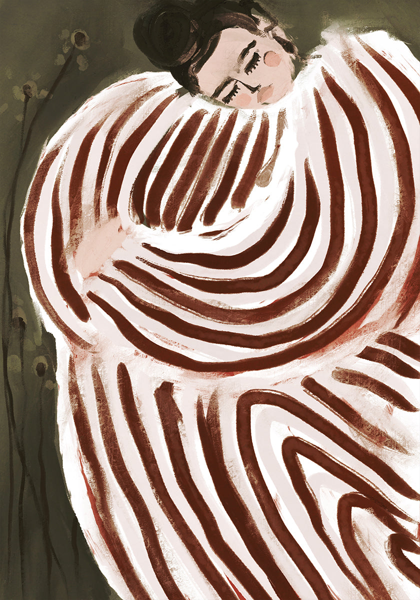 Das obige Prinzessinnen-Poster fängt die stille Schönheit in einem friedlichen Schlaf ein, eingehüllt in ein fließendes Kleid, das mit geschwungenen, organischen Streifen in erdigen Rottönen und sanften Weißtönen verziert ist. Der verträumte, illustrative Stil strahlt Wärme, Behaglichkeit und sanfte Eleganz aus und ist somit ein perfektes Statement für Schlafzimmer, Leseecken oder gemütliche Wohnräume. Die beruhigende Farbpalette und die sanften Pinselstriche schaffen eine entspannte Atmosphäre, während die ausdrucksstarken Linien einen Hauch künstlerischer Raffinesse verleihen. Ideal für Galeriewände oder als eigenständiges Kunstwerk für diejenigen, die bei ihrer Inneneinrichtung sowohl Charme als auch Ruhe schätzen.
