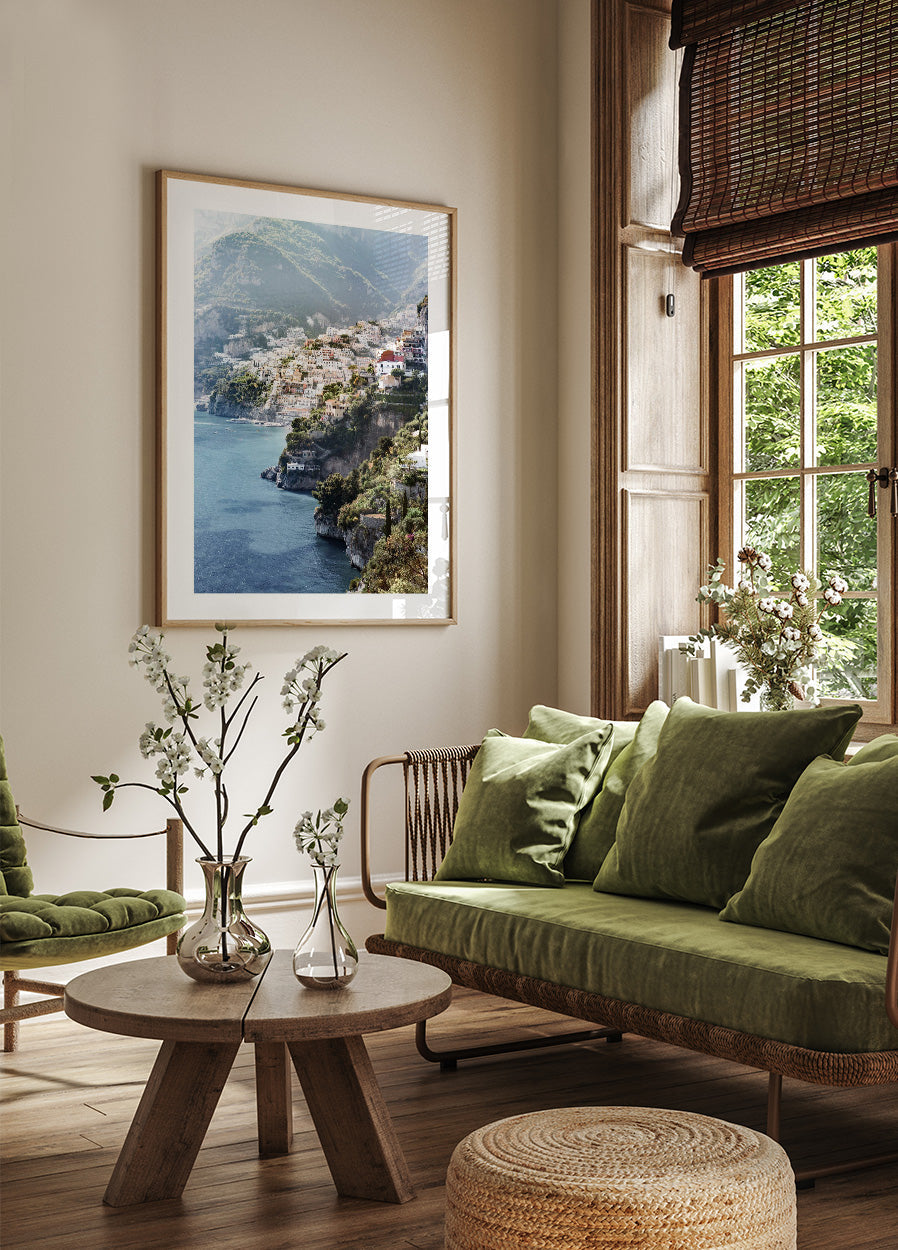 Das Poster zeigt eine malerische Küste mit einem reich bebauten Dorf auf einer Klippe, umgeben von grünen Bergen und dem Meer. Das Sonnenlicht sorgt für eine helle und warme Atmosphäre, während sich die umliegenden Berge im ruhigen Meer spiegeln. Dieses Bild erscheint als idyllische Darstellung einer malerischen italienischen Küstenlandschaft.