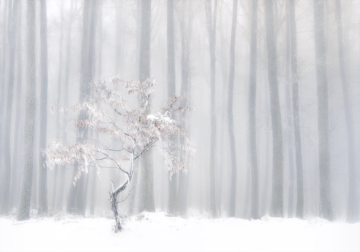 Ein einsamer Baum steht vor einem Schleier aus Winternebel, wo der Schnee jede Spur dämpft und das Licht seidig wird. Die helle Komposition sorgt für Ruhe und Besinnung, während die Konturen des Waldes im Dunst verschwinden. Eine poetische, minimalistische Landschaft vom Fotografen Peter Svoboda MQEP. Perfekt, um die stille Poesie des Winters ins Zuhause zu holen.