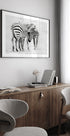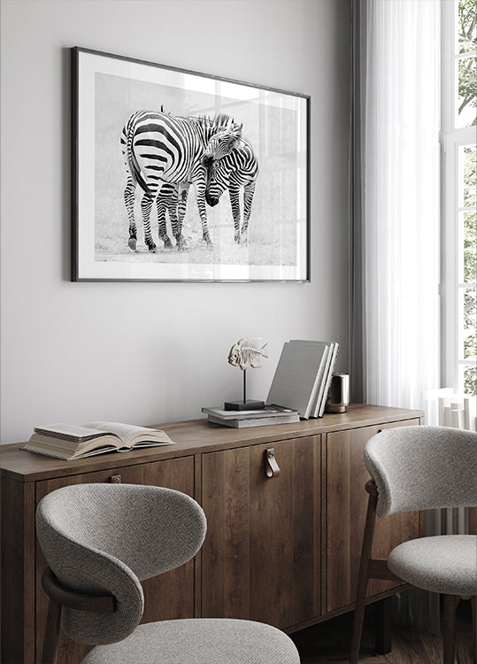 Auf diesem poetischen Schwarz-Weiß-Fotoposter begegnen sich zwei Zebras in einer zärtlichen Umarmung in der kenianischen Savanne. „Tender Moment“ des Fotografen John Fan fängt Ruhe, Nähe und zeitlose Eleganz mit leuchtendem Ausdruck ein, wobei der grafische Rhythmus der Streifen zu einem minimalistischen Symbol für Liebe und Zusammengehörigkeit wird. Eine Hommage an die Poesie der Natur.
