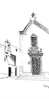 Eine stimmungsvolle, monochrome Illustration eines charmanten portugiesischen Stadtplatzes: weiße Fassaden, verzierte Türen und Fenster, ein ruhiger Kirchplatz und enge Gassen, die in scharfen Linien und sanften Schatten aufeinandertreffen. Minimalistische Strichzeichnung von Awol Art Alex, die Fernweh und zeitlose Architektur in der Sonne einfängt.