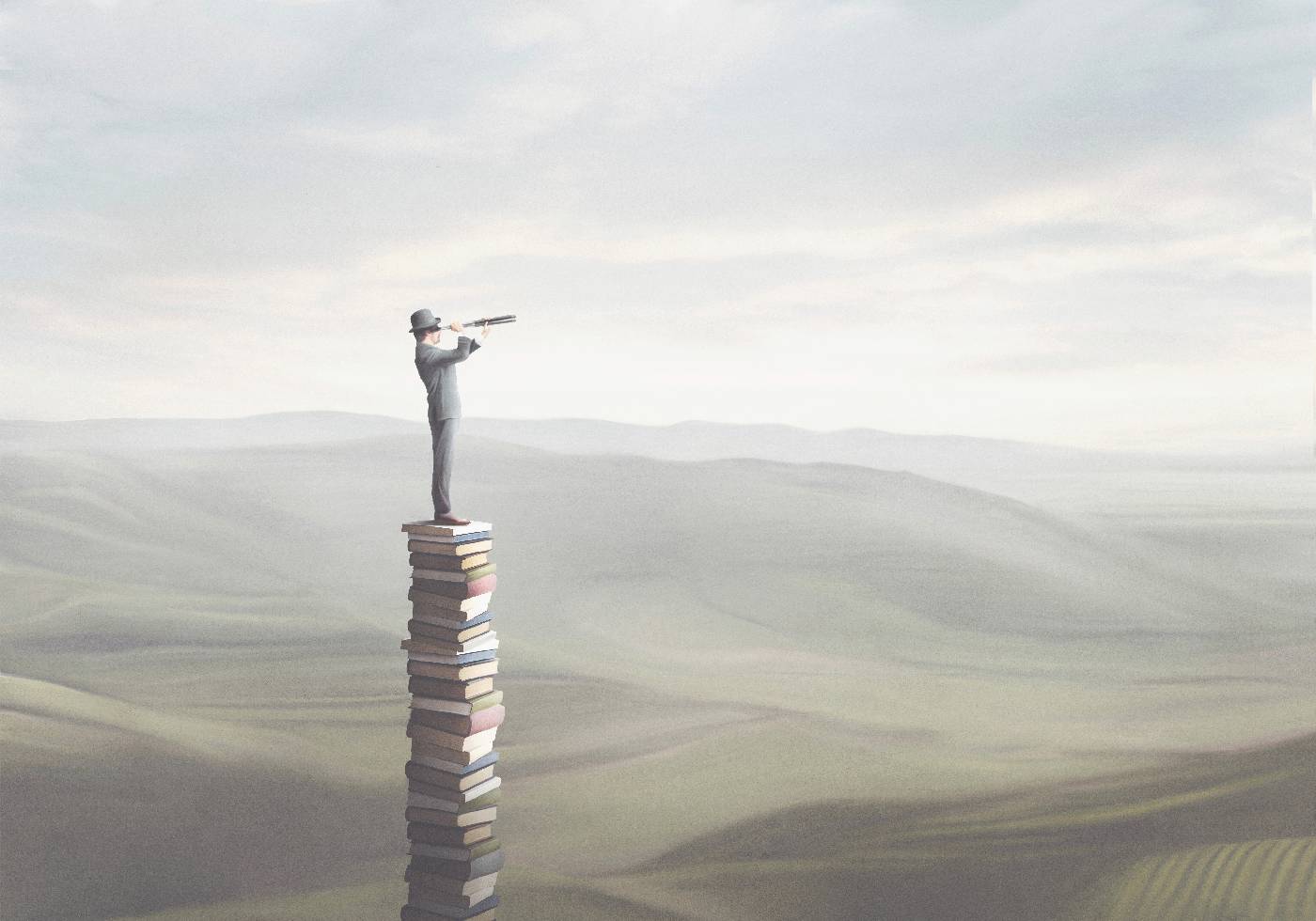 Das Tower of Books Poster* ist eine inspirierende surrealistische Illustration, die Wissen, Lernen und neue Perspektiven symbolisiert. Ein Mann im Anzug steht auf einem hohen Bücherstapel und blickt durch ein Fernglas – eine schöne Metapher dafür, wie Bildung und Weisheit Horizonte öffnen. Perfekt für Bibliotheken, Büros, Klassenzimmer oder für diejenigen, die persönliche Entwicklung und intellektuelle Entdeckungen lieben.