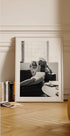 Ein elegantes Schwarz-Weiß-Foto einer Frau, die sich entspannt, ein Handtuch um ihr Haar gewickelt, während sie Vogue liest. Das Kunstwerk fängt einen Moment luxuriöser Ruhe und müheloser Eleganz ein und eignet sich perfekt als Statement in Innenräumen, die von Mode, Schönheit und moderner Eleganz inspiriert sind.
