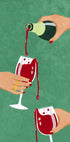 Eine farbenfrohe Illustration von Händen, die Rotwein in Gläser gießen, aus denen der Wein auf verspielte und festliche Weise überläuft. Mit kräftigen Farben und stilvollen Details fängt das Stück die Freude an Zusammenkünften, Cocktails und gemeinsamen Momenten ein und wird zu einem schicken und lebendigen Element in modernen Innenräumen.
